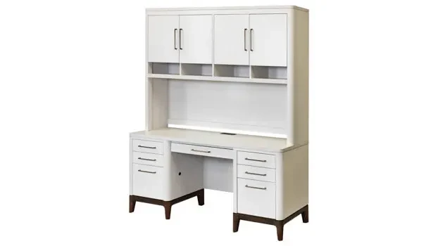 Hutch has two adjustable shelves behind the doors for customization of office items.